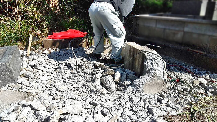 工事スタートです。通常のお墓じまいでは、お寺様にお経をあげていただいたりといった閉眼法要をし、可能であればお墓の中のご遺骨を取り出してから工事を始めます。(お墓の構造によっては、お墓を取り外さないとご遺骨を取り出せない場合もあります。)今回はすでにご遺骨は取り出してありましたので、そのまま工事に入ります。